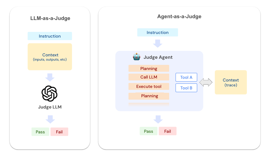 Agent-as-a-Judge 代表了 LLM 评估范式的一次重大转变。这些评估器不仅仅是评估输入和输出,而是充当 **自主代理**,配备了工具来深入调查您的应用程序的执行情况。